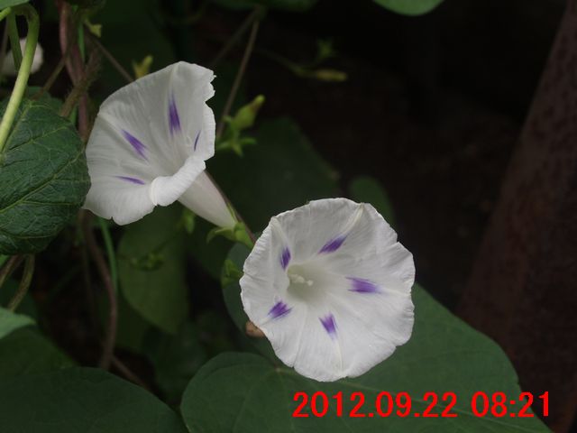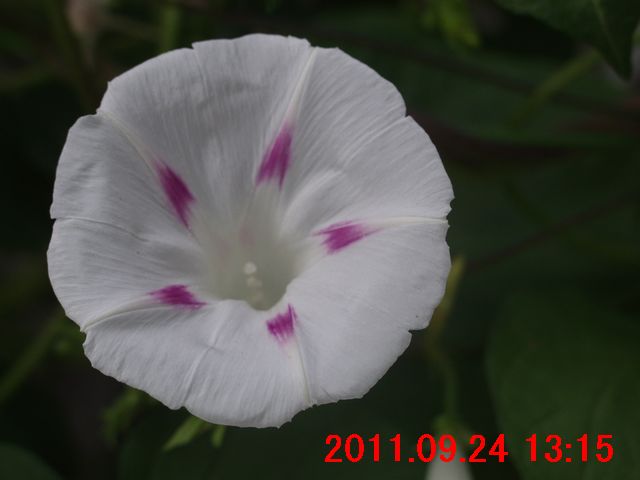 初めてのときは、白い花に血が付着している。と、思った。気持ち悪かったが、怖いもの見たさで、近づいて見た。血に見えたものは、近づいて見ると、小豆(あずき)色の斑点だった。アサガオに似ている花で、未知の花だった。