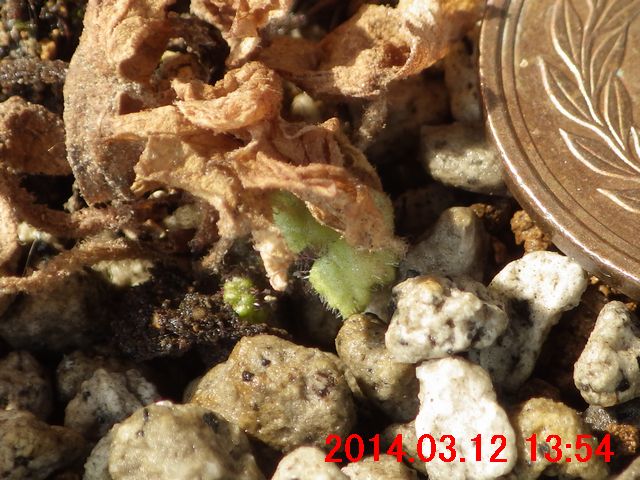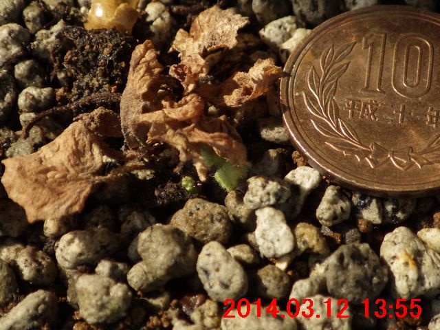 1年前の記事、「鉢の中の春の訪れ」の画像 1 と、画像 3 にひっそりと写っている小さな葉は一人前の形をしている。だが、本日のものは、まだ、一人前の形をしていない。