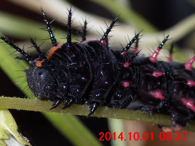 黒色でトゲトゲ状の突起と棘。突起の下部が紅色。胸部から尻近くまでの背面に、鮮やかな橙色の縦筋模様が1本。