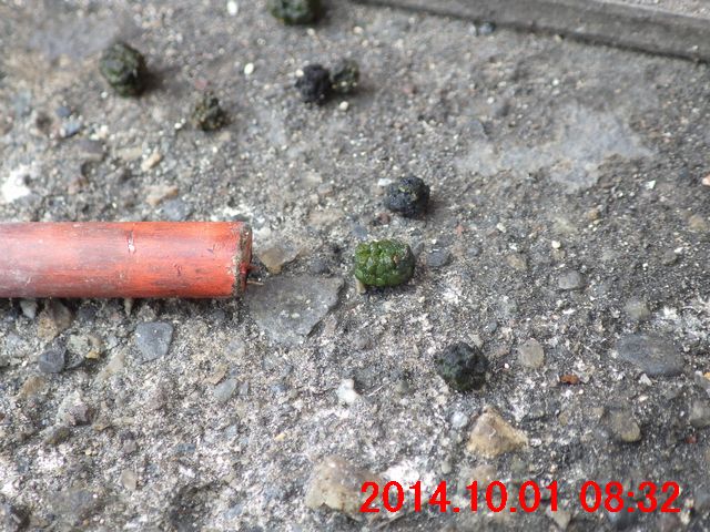 新しい濃緑色の糞は細かい粒の塊であると見て取れた。大きさの比較で、画像に写りこんでいる赤色の棒は直径5.0mm。画像の新しい糞は、長径4mm、短径3mm程度のようである。