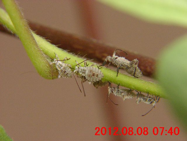 後日、正体の判った、ホオズキカメムシの幼虫。8月8日の時点では、まだ、未知の虫だった。