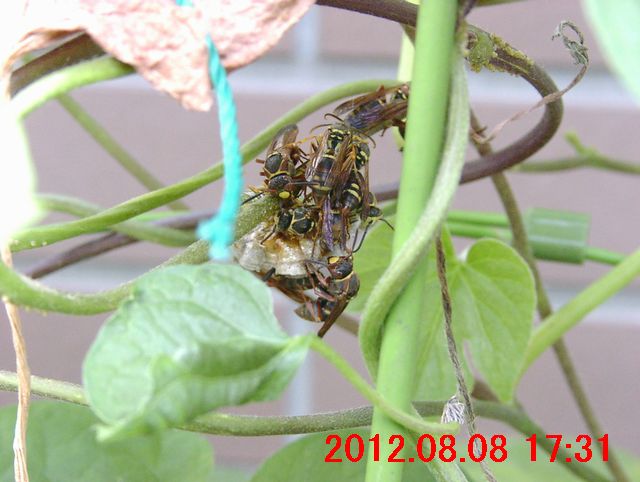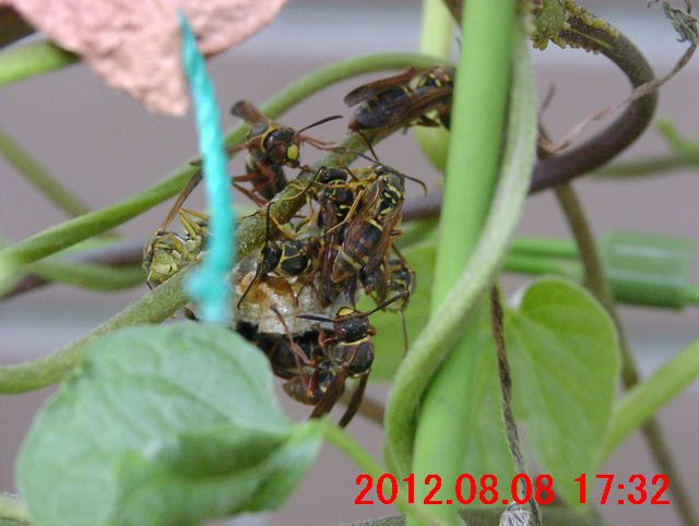 朝方、ノアサガオの葉の上に蜂がいた(画像1)が、同じ蜂らしい。巣作りの雰囲気から、アシナガバチ(脚長蜂)の仲間と思った。