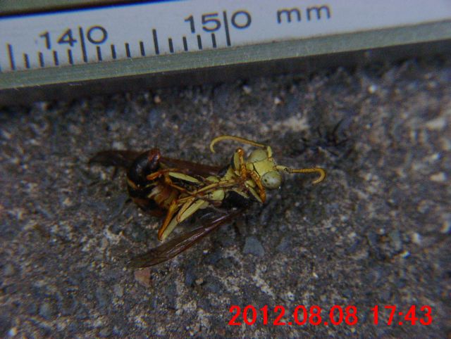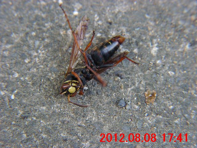 黒い地色に黄色と茶褐色の紋が入ったアシナガバチの仲間。