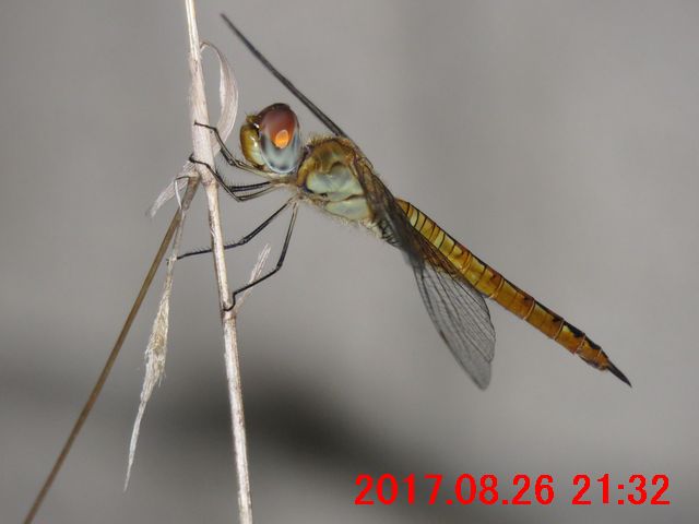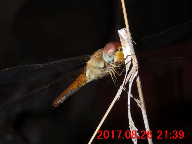 2017年8月26日の夜、ウスバキトンボ(薄翅黄蜻蛉)がとまっていることに気付いた。