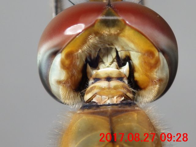 写っている主な部品は、左右の複眼、前額、頭楯、唇。他に額隆部も写っている。