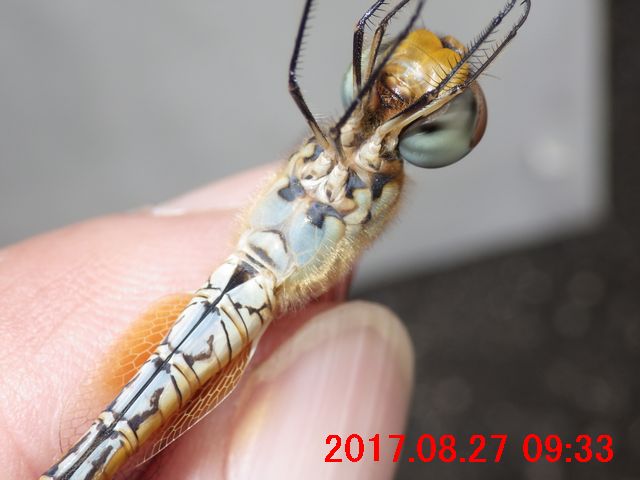 胸部側面の第一側縫線(だいいちそくほうせん)に沿う黒条(黒色の帯状の模様)の先端の形状が、ナツアカネと物語っていた(画像 5 )(※1 )。