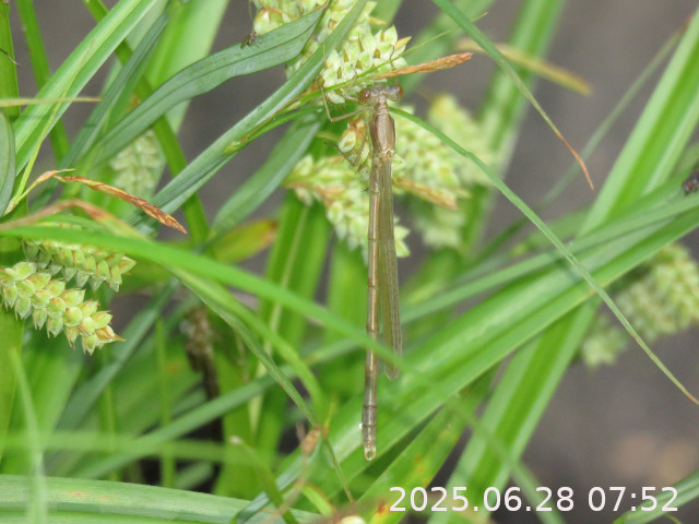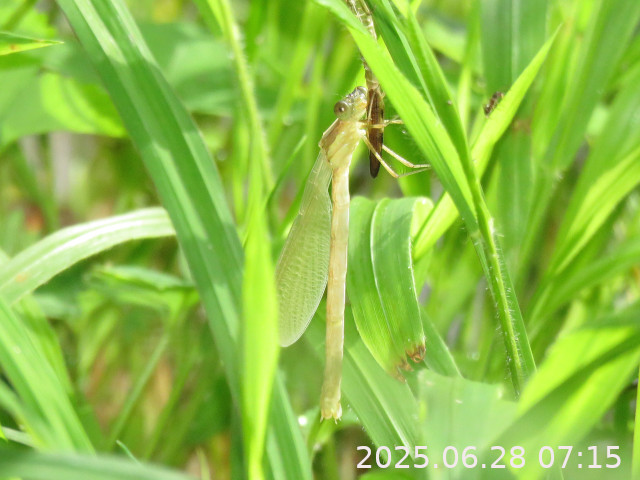 2025年6月28日、山の湿地では未熟なアオイトトンボが出迎え、観察地点では羽化が見られた。
