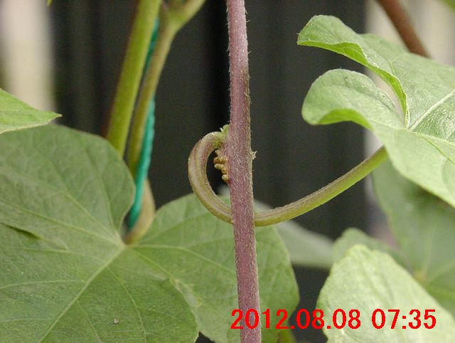 教材のプランタに2株。蔓は、軒下にまで届き、絡まっていた。