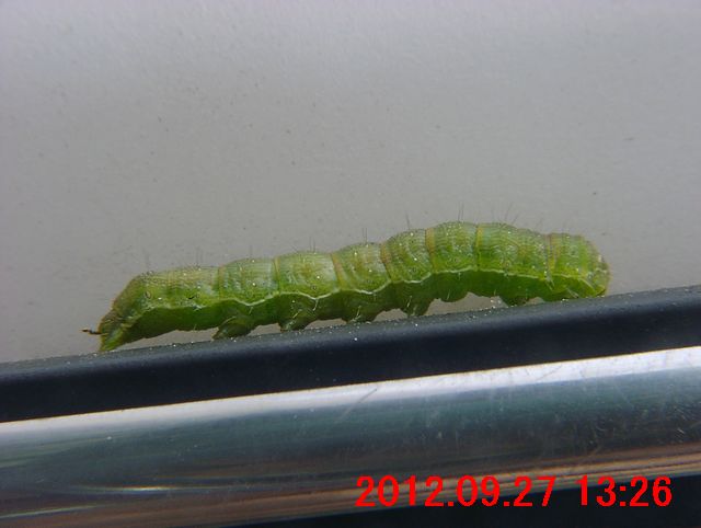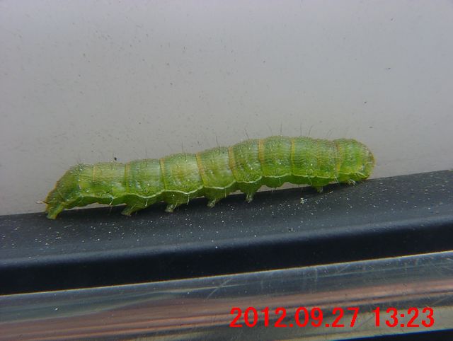 10月3日にも、オオタバコガの緑色型幼虫を捕まえた。体長約30mm。