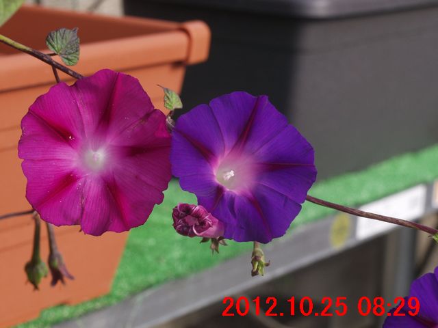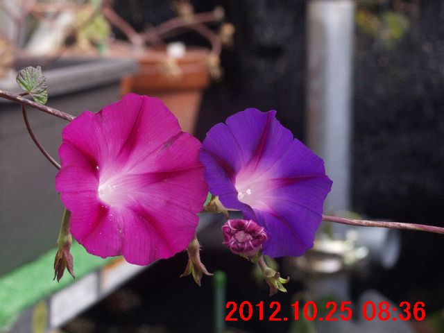 濃い紫色(濃紫色)の花のマルバアサガオだが、画像の左は昨日開花したもの。