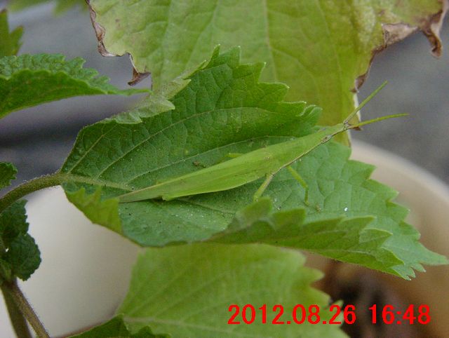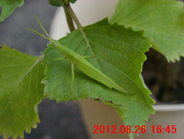 後日、マルバアサガオ(丸葉朝顔)の鉢の傍でも、オンブバッタが歩いているのを見かけた。鉢の傍で見かけただけで、オンブバッタがマルバアサガオの葉を食うかどうかは確認していない。