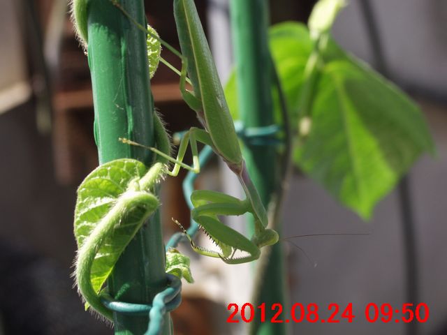 日中は姿が見えなかったが、夕刻は、朝と同じ左の支柱の上部にいた。葉の表面につかまっていた。こちらから見ると、陰。しかし、触角がはみ出ていたので、その存在がばれてしまった。