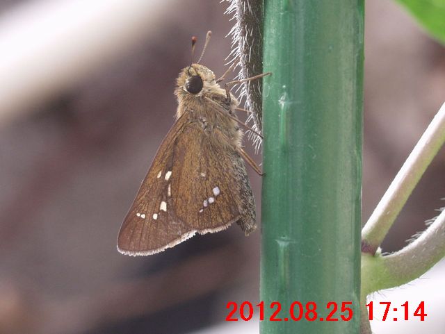 画像2 マルバアサガオの蔓で休むイチモンジセセリ撮影した画像から、後翅の白い点が4つ、ほぼ直線に並び、そして、白い点が下に行くほど大きいことが確認できた。以上のことからイチモンジセセリ(一文字挵)と判った。