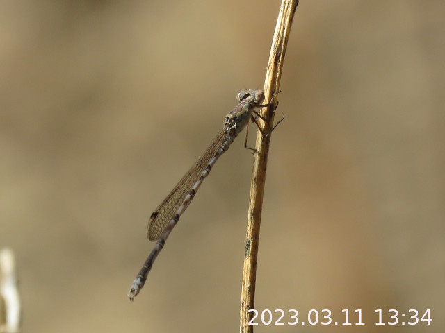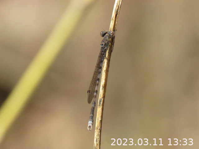前年は3月11日から4日間だけ水辺に越冬保護色の枯葉迷彩のホソミイトトンボ(細身糸蜻蛉)とホソミオツネントンボが集結するかのように出現したことがあった。ホソミイトトンボが多数で、ホソミオツネントンボが少数だった。